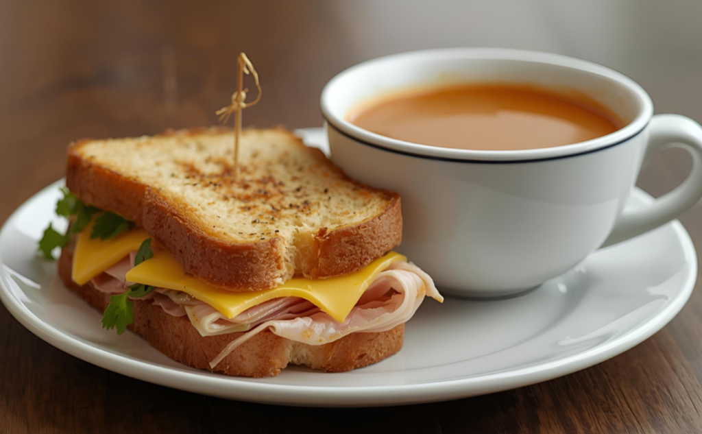 ④サンドイッチをラップから取り出して器に盛り、スープカップにオニオンスープの素とお湯を適量注いで完成です。