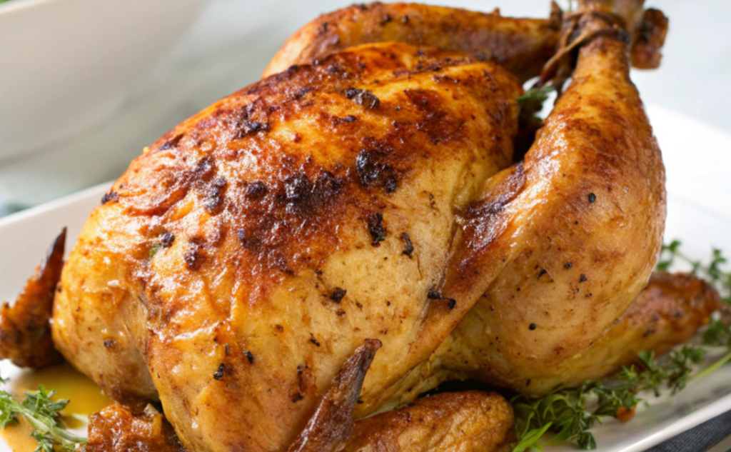 ①丸鶏肉全体にハーブソルトをすりこみます。