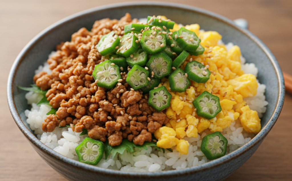 ⑥器にご飯をよそい、鶏そぼろ、卵、おくらを乗せて完成です。